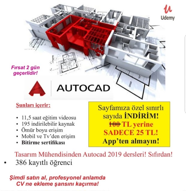 Harika bir fırsatla karşınızdayız. Mühendis Çekmecesi Ailesine özel %75 indirimli Autocad 2019 Udemy Eğitimi sizlerle. Sınırlı süreli bu kampanyayı sakın kaçırmayın. Bize özel bu indirime sahip olmak için aşağıdaki linke tıklayarak 100 TL değerindeki bu eğitime sadece 25 TL ye sahip olabilirsiniz… Link görüntünün altında…
